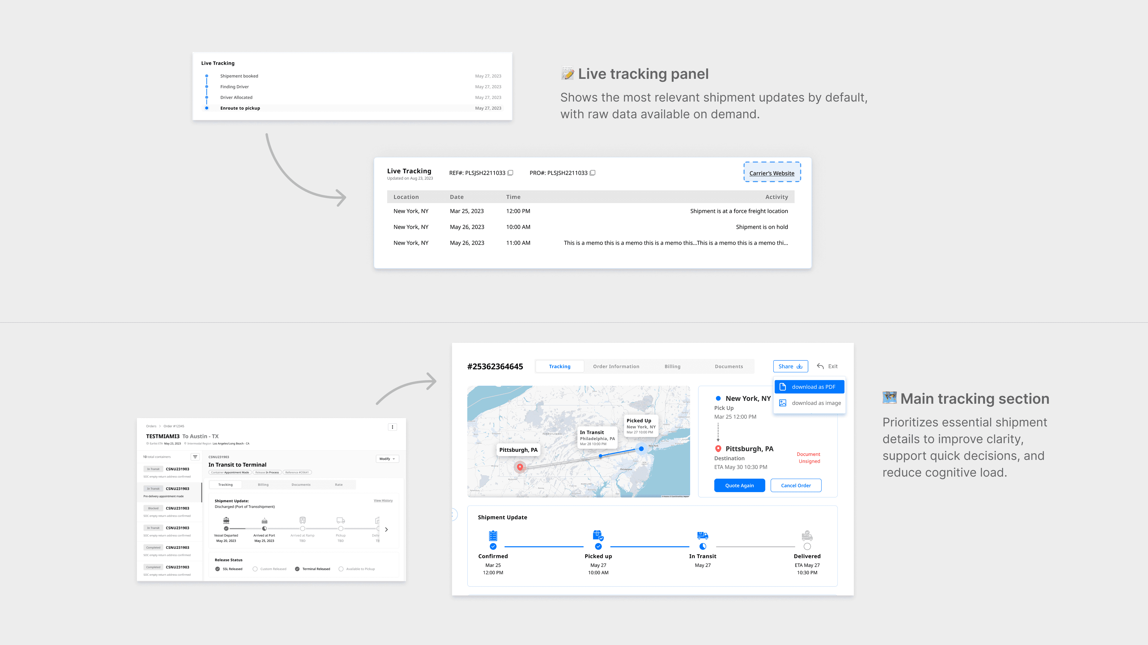 A tracking experience that brings together shipment status, route visibility, milestones, and key references in one place. This reduced the need to piece together information across disconnected views.