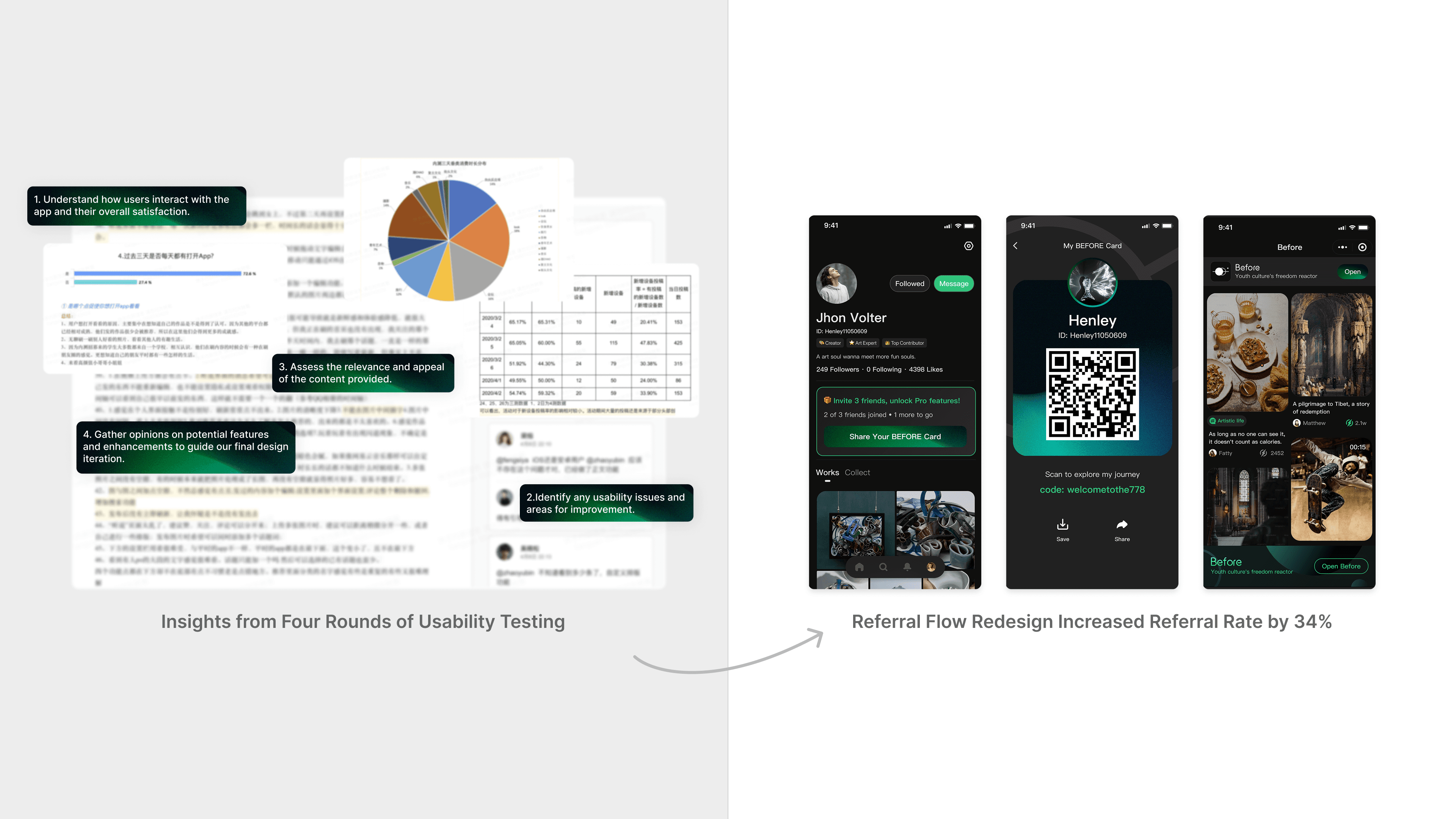 After the initial design direction was set, we ran four rounds of unmoderated user testing and continued refining the product using behavior data. This phase made it clear that building community also meant reducing friction. We discovered that content creation intimidated many users, with a 54% drop-off during the posting flow, so we simplified creation, added suggested tags and visibility settings, and made editing feel more guided and approachable. We also noticed that growth through social connections was far stronger than app store discovery, which led to a better referral system with personalized sharing cards, QR codes, and consistent cross-channel branding. In parallel, creator ranking and progress tracking were introduced to motivate more participation. These changes drove measurable gains in creator activity, retention, and referrals, proving that small UX improvements could compound into stronger community growth.