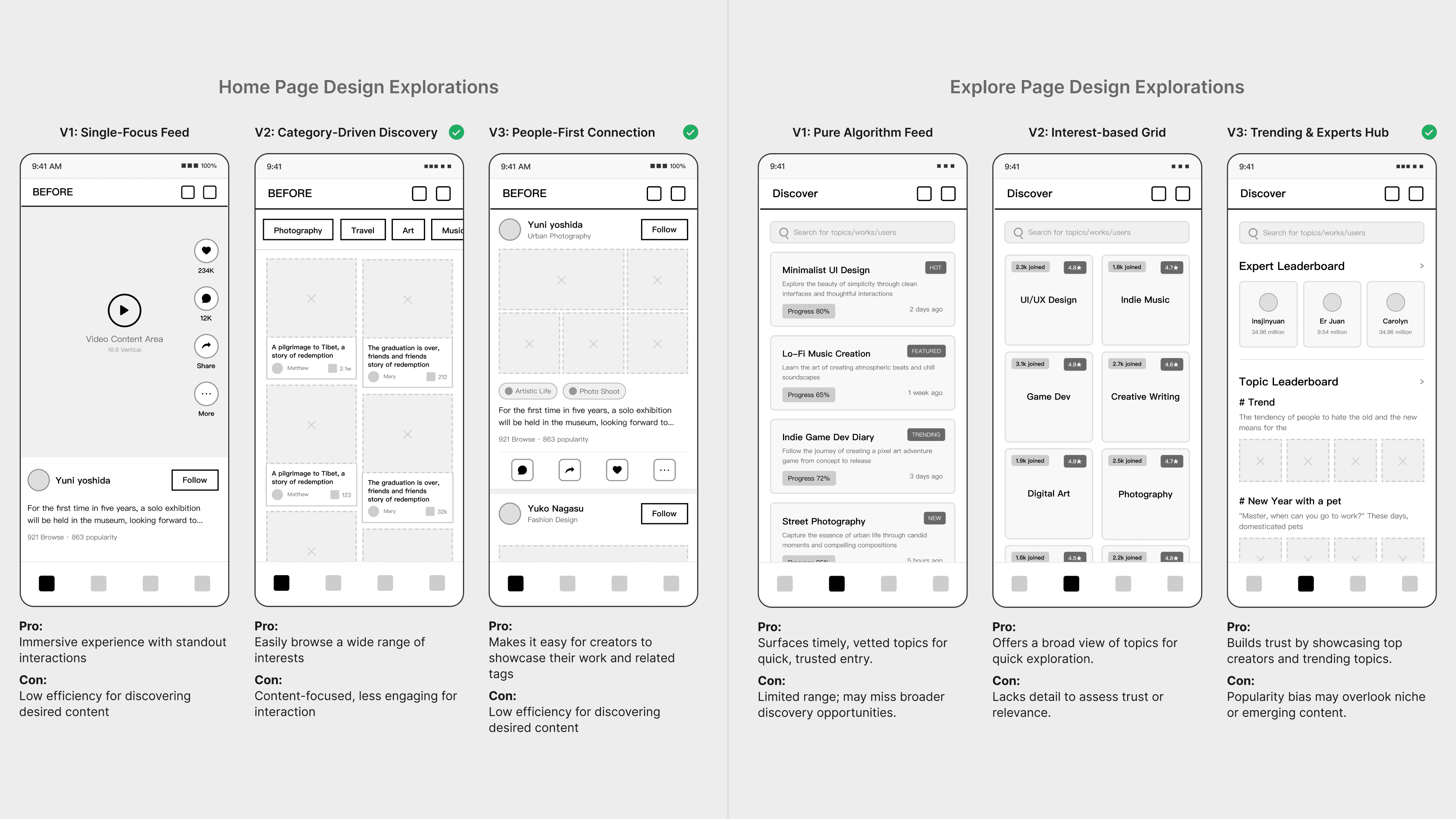 Once we had clarity on the problem, the next step was translating that insight into a product structure people could actually feel. We framed the experience around Discover → Connect → Deepen, then tested how each core surface could support that journey. On the home page, we balanced curated exploration with relationship-building through Recommend and Following. On the explore page, we shifted discovery toward communities and trusted spaces instead of endless passive scrolling. In messaging and profile design, we built a system that supported both public and private interaction, giving users more control over how they connected. Across all of these decisions, the design goal stayed consistent: lower the emotional barrier to participation and make the platform feel less cold, less noisy, and more personally relevant. The work was less about adding features and more about aligning the whole experience to one social principle: belonging drives engagement.