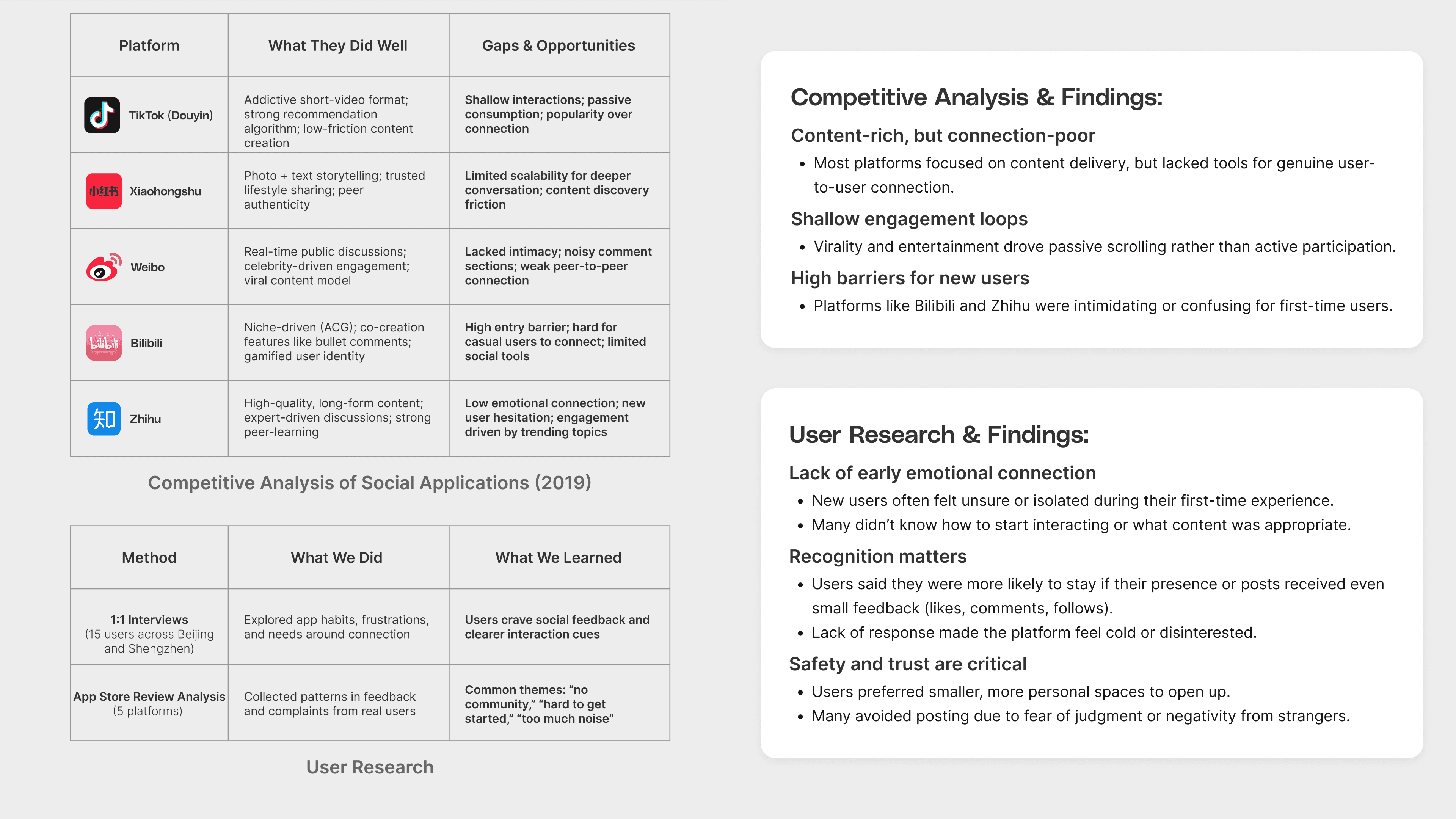 We started by looking at the market from both a product and human perspective. Competitive analysis showed that many platforms were strong at content delivery, but weak at helping people form genuine user-to-user connection.